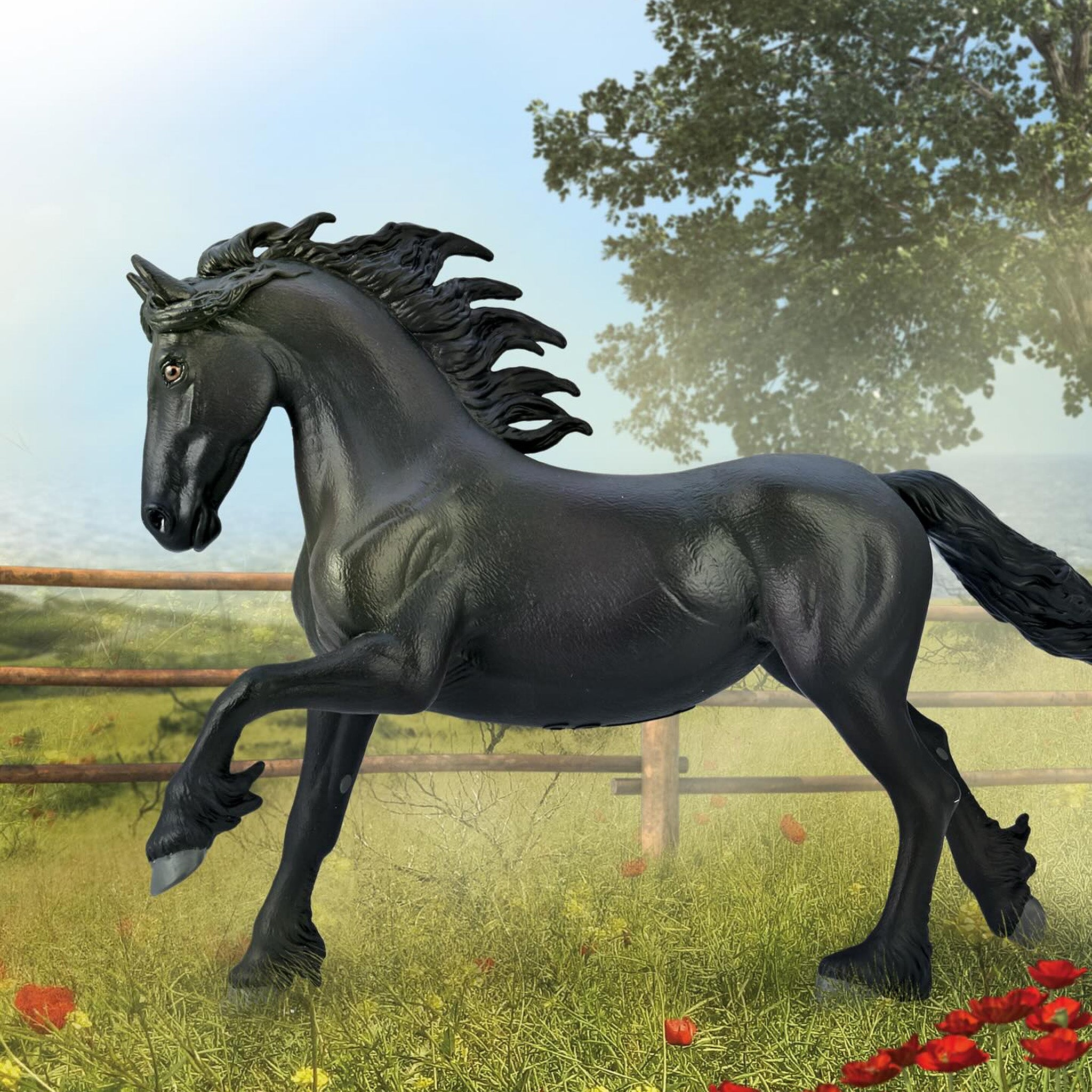 Known for a gentle and willing temperament, she is equally suited to riding, dressage, and driving, making the Friesian mare a favorite among horse enthusiasts worldwide for her beauty and loyal disposition.