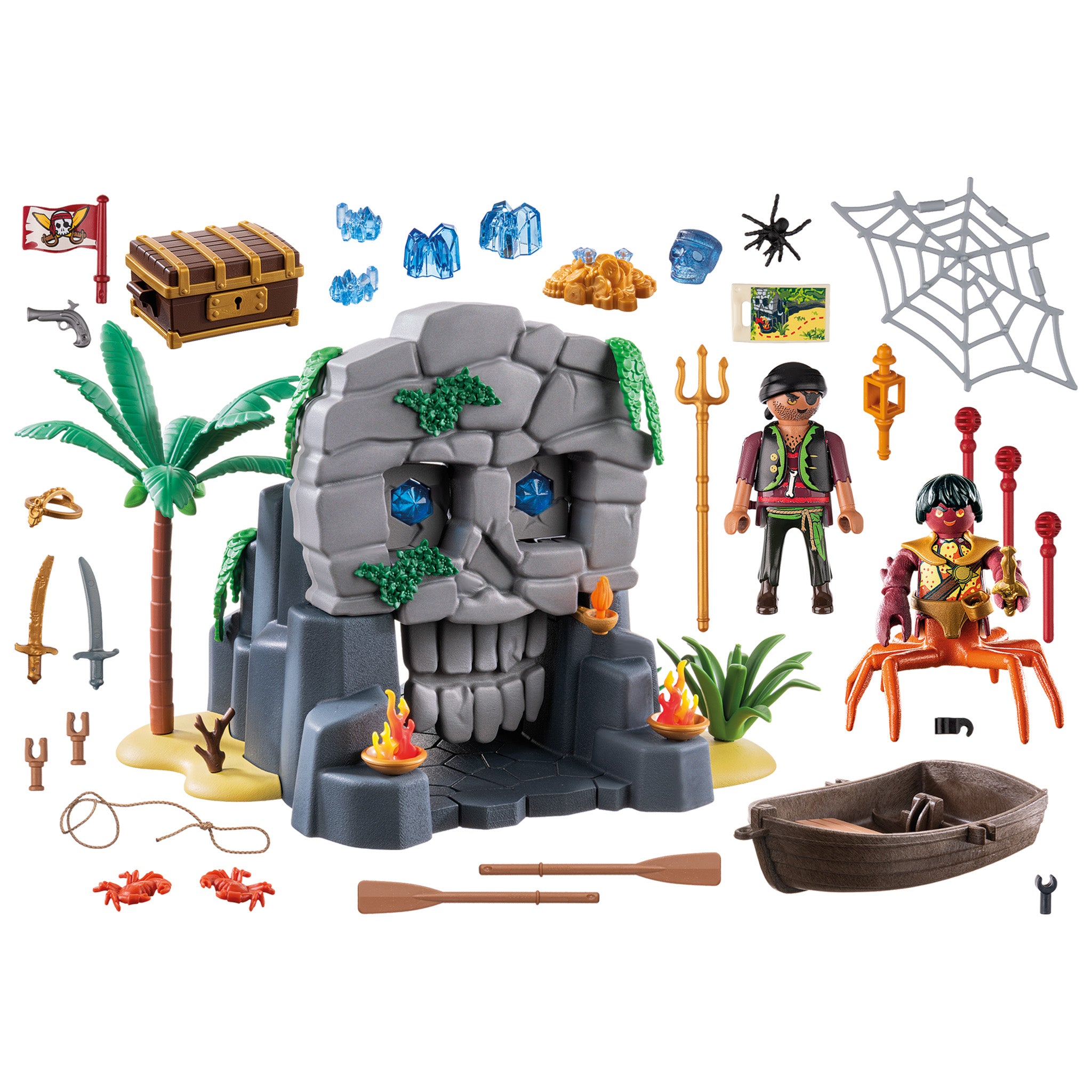 - Pieces: Figures: 1 pirate, 1 crab man; Animals: 2 crabs, 1 spider; Accessories: 1 rock, 1 rock-look skull, 1 crystal skull,2 crystals, 2 floor tiles, 1 palm tree, plants, 2 fire bowls, 1 flame, 2 sabers, 1 trident, 1 dagger, 1 map, 2 cannons, 3 projectiles, 1 spider web, 1 boat, 1 flag, 1 lamp, 2 oars, 1 hat with pin, 1 string, 1 branch, 1 crown, 1 chest, 1 gold treasure with crystals, 1 gun.
