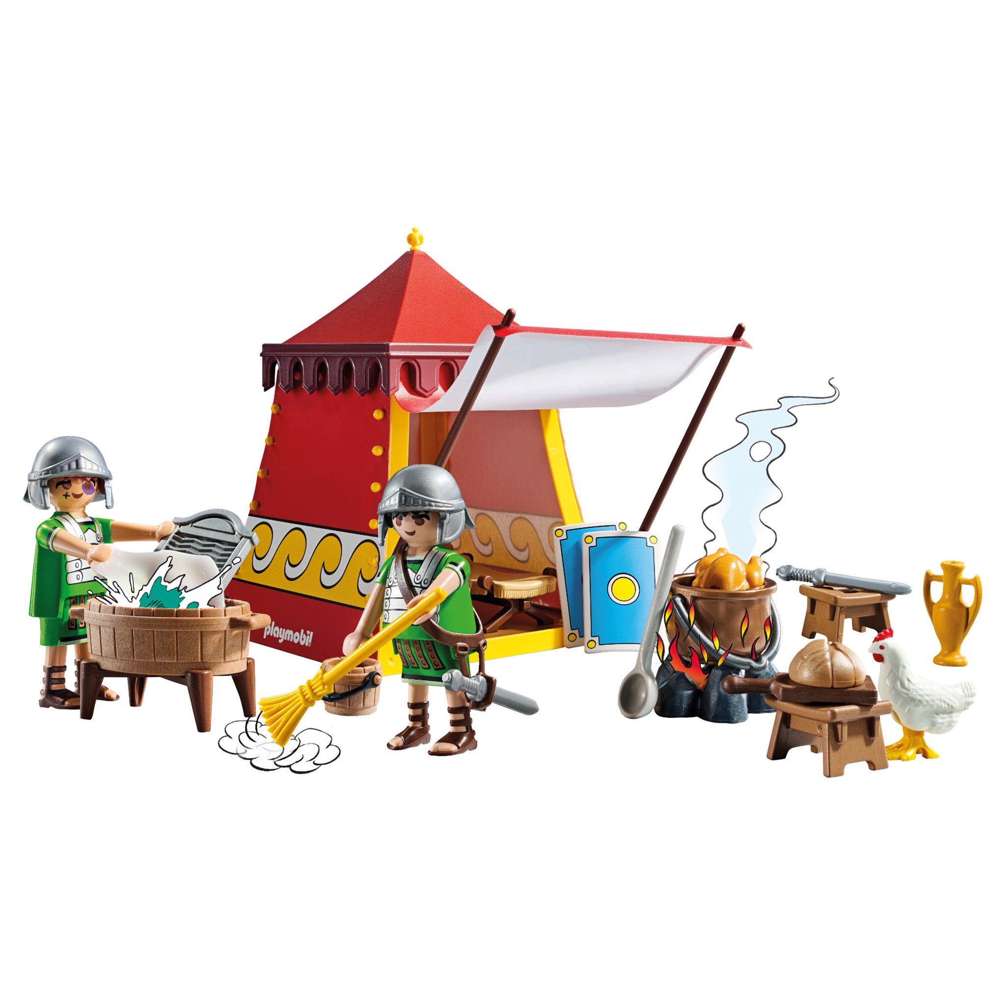 Contents: Figures: 2 Legionnaires. Accessories: 1 tent, 2 beds, 2 stools, 2 helmets, 2 swords, 2 shields, 2 spears, 1 basin, 1 towel, 1 washboard, 1 cup, 1 bread, 2 chickens, 1 broom, 1 soup spoon, 1 large pot, 1 small bowl, 1 fireplace.