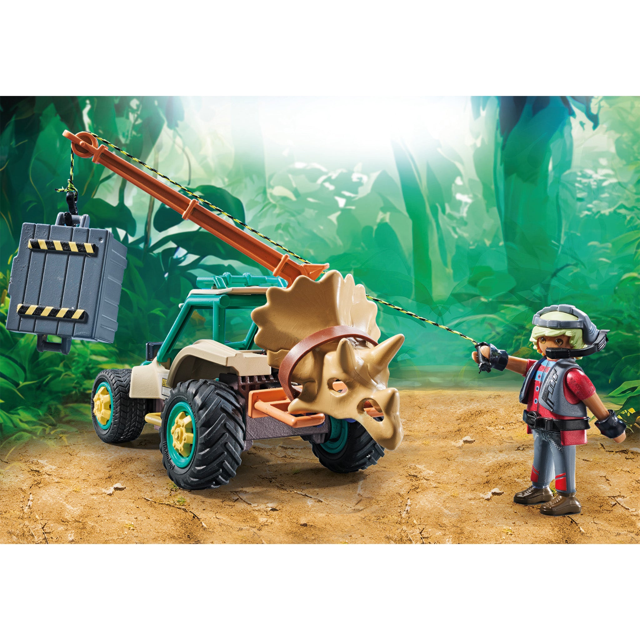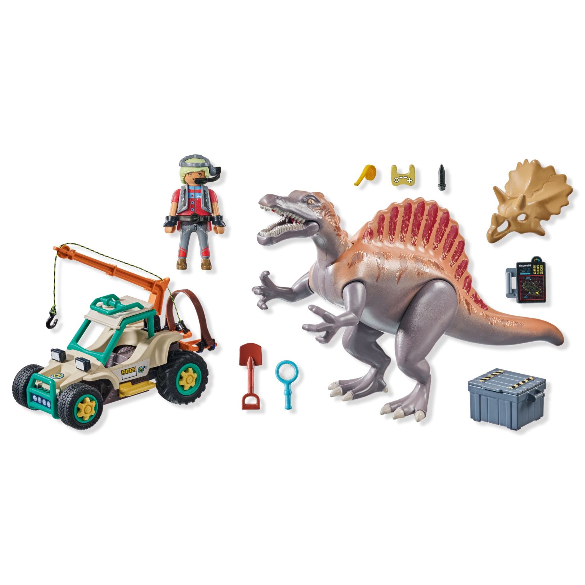 During an exciting excavation, the researcher comes across the dangerous Spinosaurus. The researcher's car provides the perfect escape from the aggressive dinosaur with its large, movable jaw. A swiveling crane on the cart allows the researcher to safely move a crate full of useful accessories. However, the main goal of the expedition is to recover the impressive skull of a Triceratops. Includes a dinosaur knowledge card.