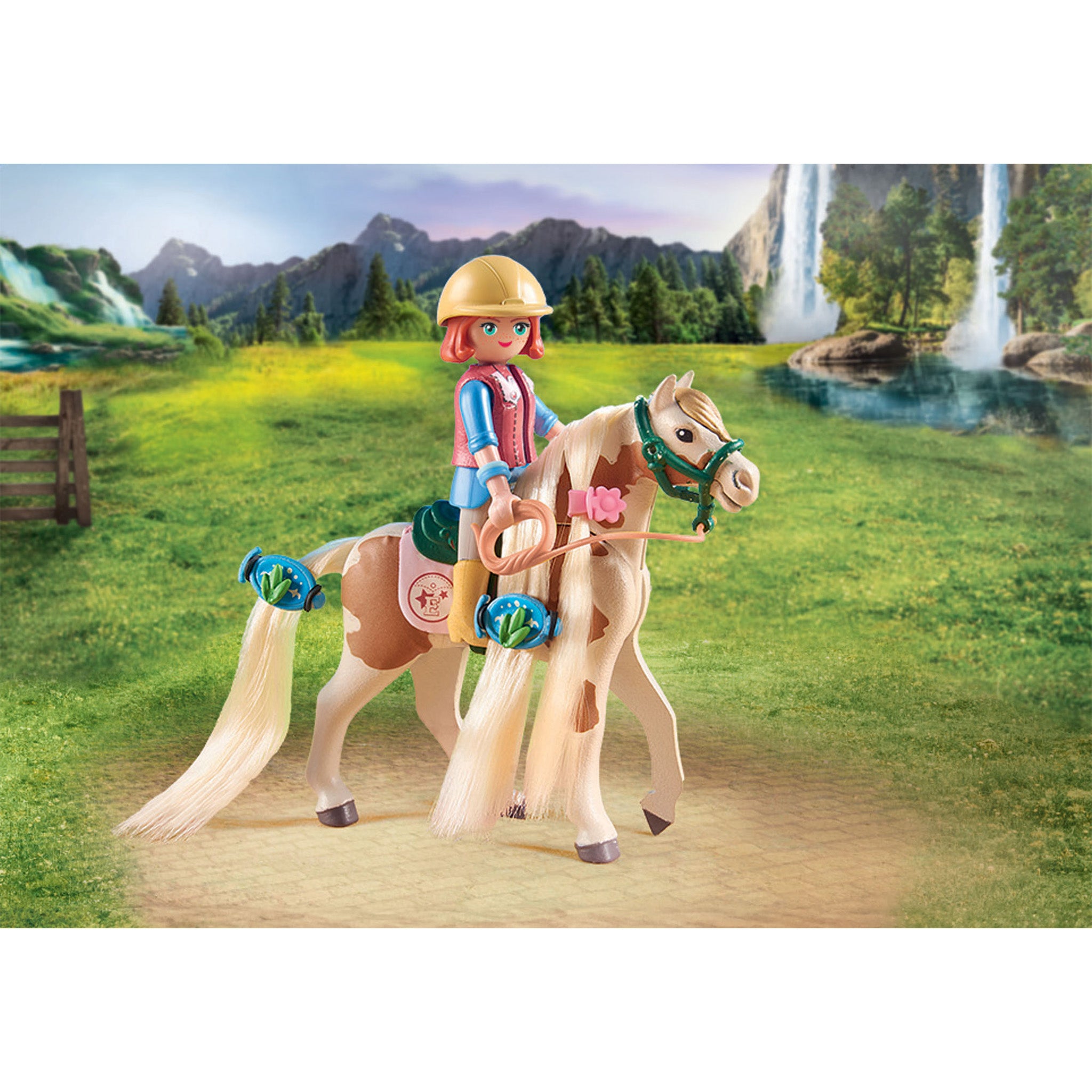 Ellie loves to decorate the combable mane and tail of her guest horse Pinto with beautiful brooches. Before she takes the Paint Horse gelding for a ride, a special highlight awaits him: hairdressing with the crimping iron, which is also included in the set. With his crimped mane, Pinto is the new star of the Waterfall Ranch!