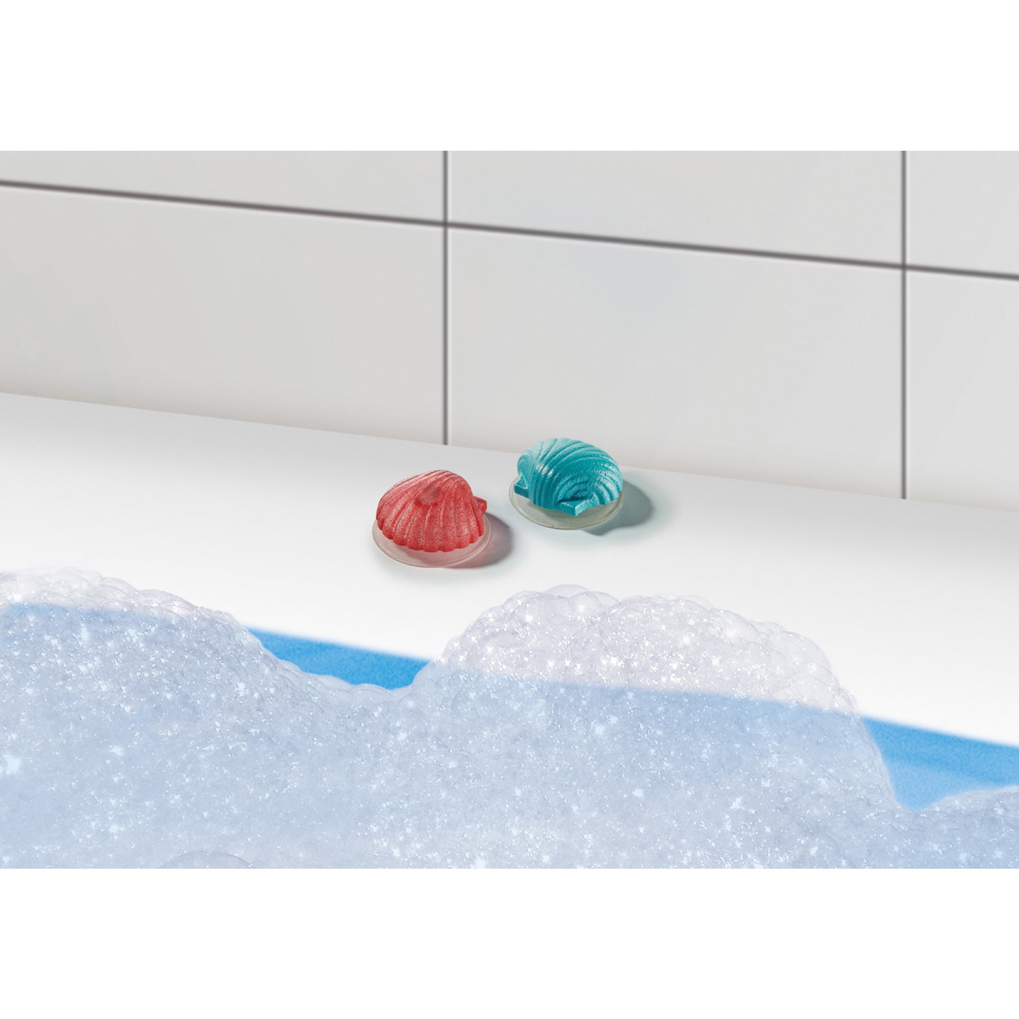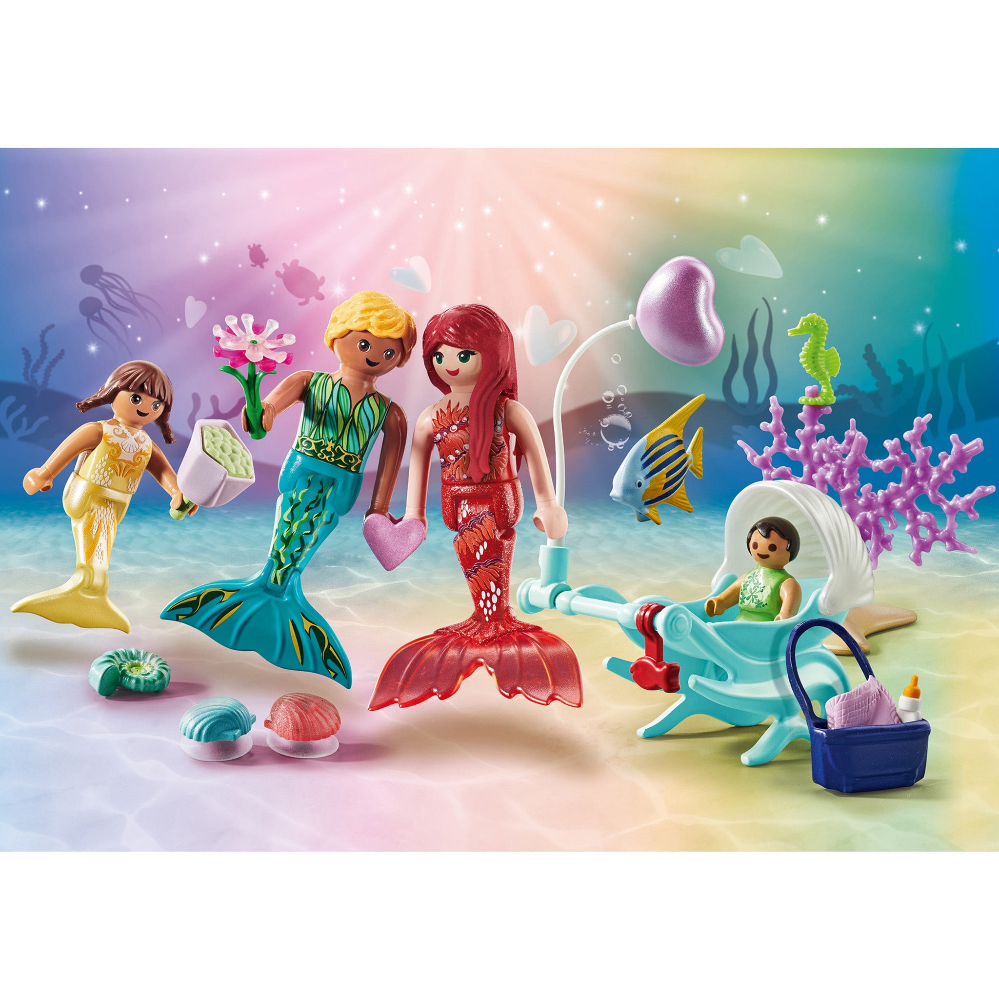 On Valentine's Day, the loving mermaid family enjoys a walk together. With enchanting accessories and two decorative shells to attach to smooth surfaces (incl. suction cups).