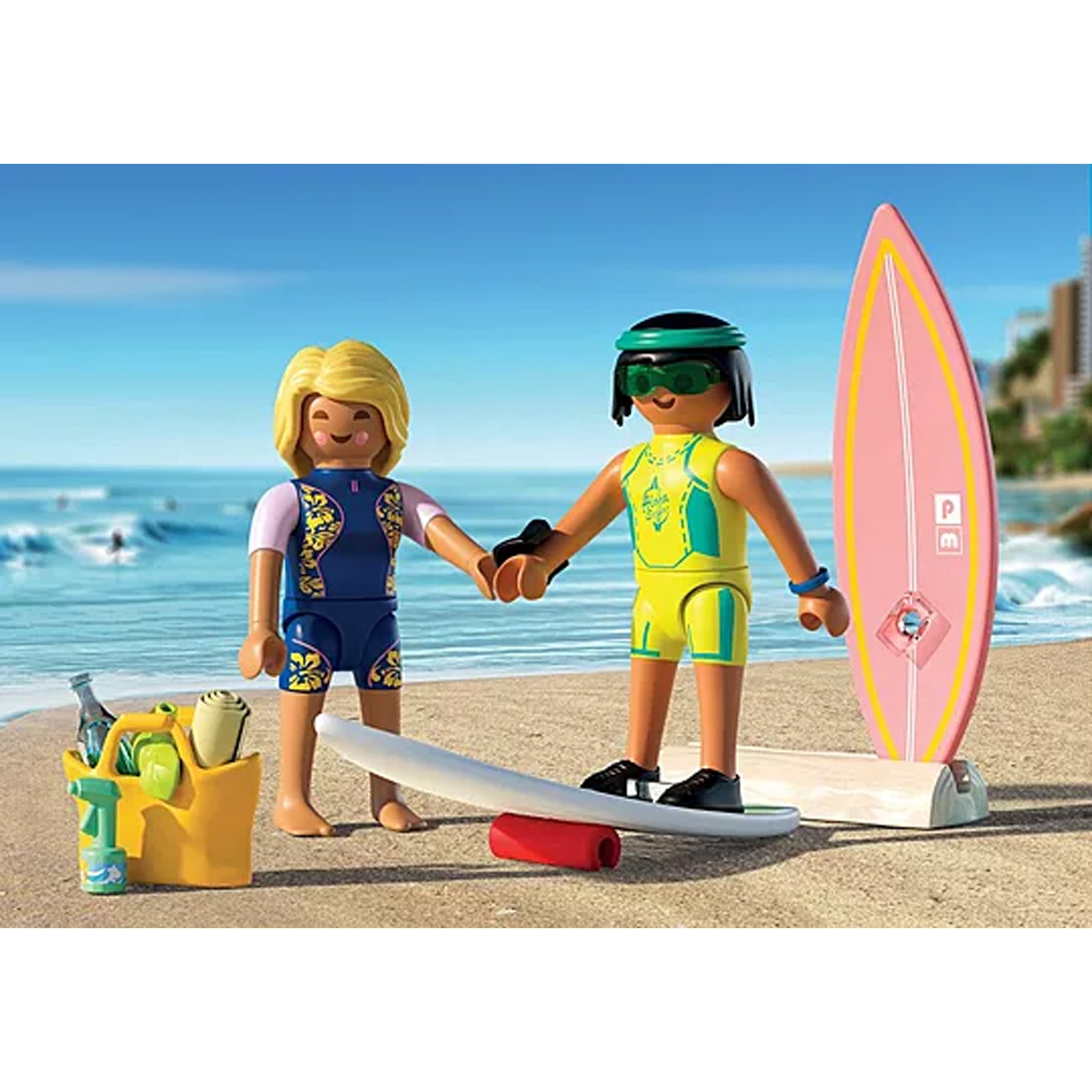 Contents: Characters: 1 man with sunglasses and headband, 1 woman; Accessories: 2 surfboards, 1 holder for surfboards, 1 roll for surf training, 1 beach bag with towel and bottles