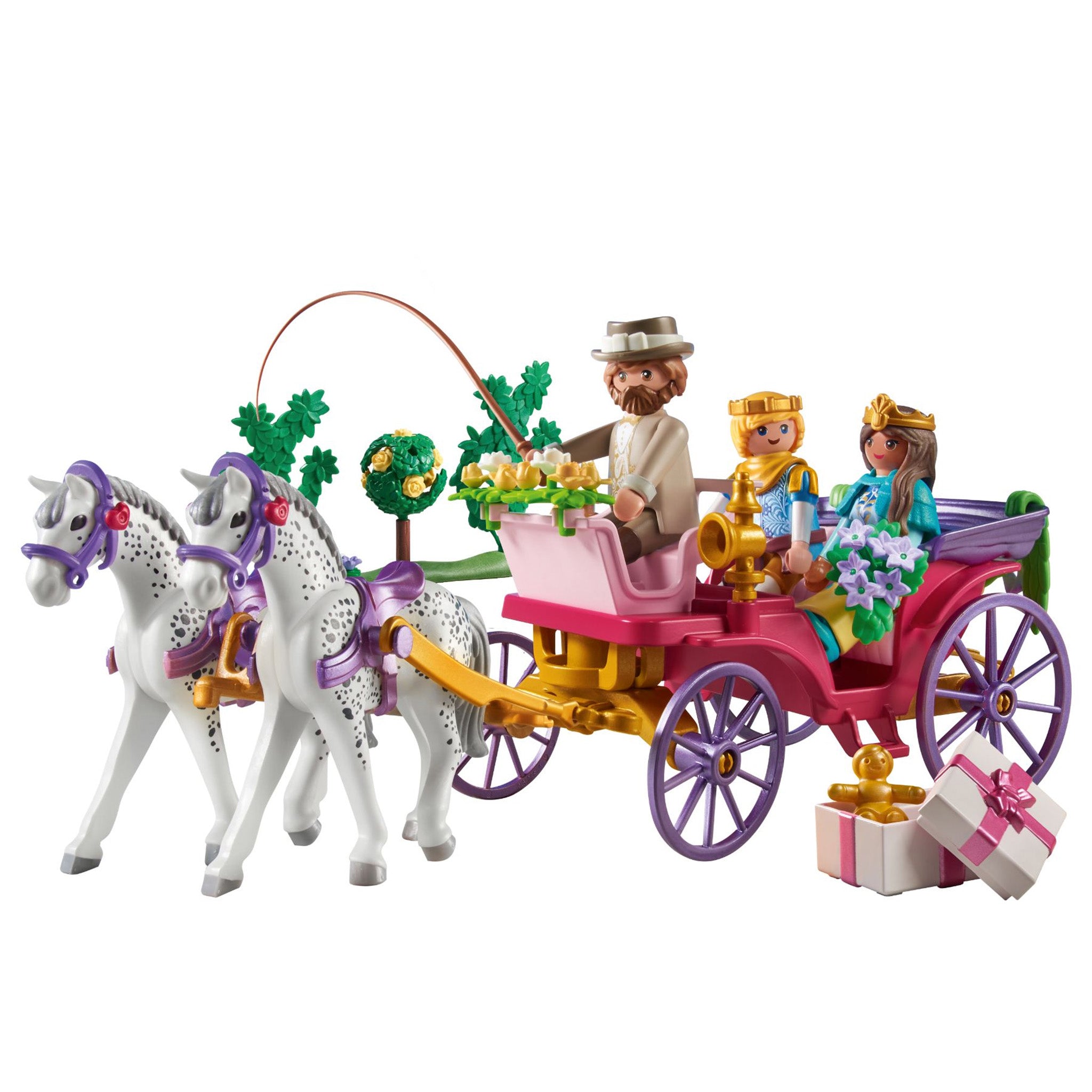 Take a seat in the elegant carriage where the prince and princess relax in the back while the coachman leads the journey. Adorn the horses' harness with charming hearts before embarking on a romantic ride along a picturesque promenade. Hidden in the carriage is a gift box with a noble present for the royal couple. Enjoy enchanting storytelling with this magical Playmobil Carriage Ride set.