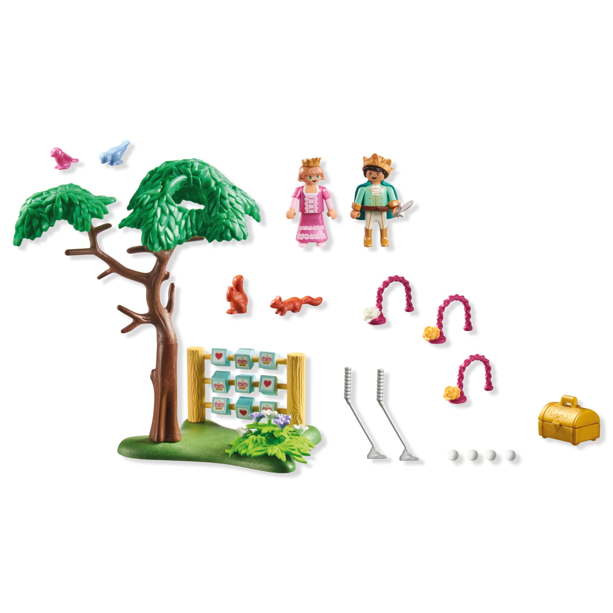 Contents: Figures: 1 girl, 1 boy, Animals: 2 squirrels, 2 birds, Accessories: 1 crown, 1 cloak, 1 sword, 1 small crown, 2 mini golf clubs, 4 balls, 1 treasure chest, 3 gates with rose blossoms, 1 green plate, 1 tree trunk, 2 tree crowns, 1 green plant with blossoms, 1 wooden frame, 9 dice.