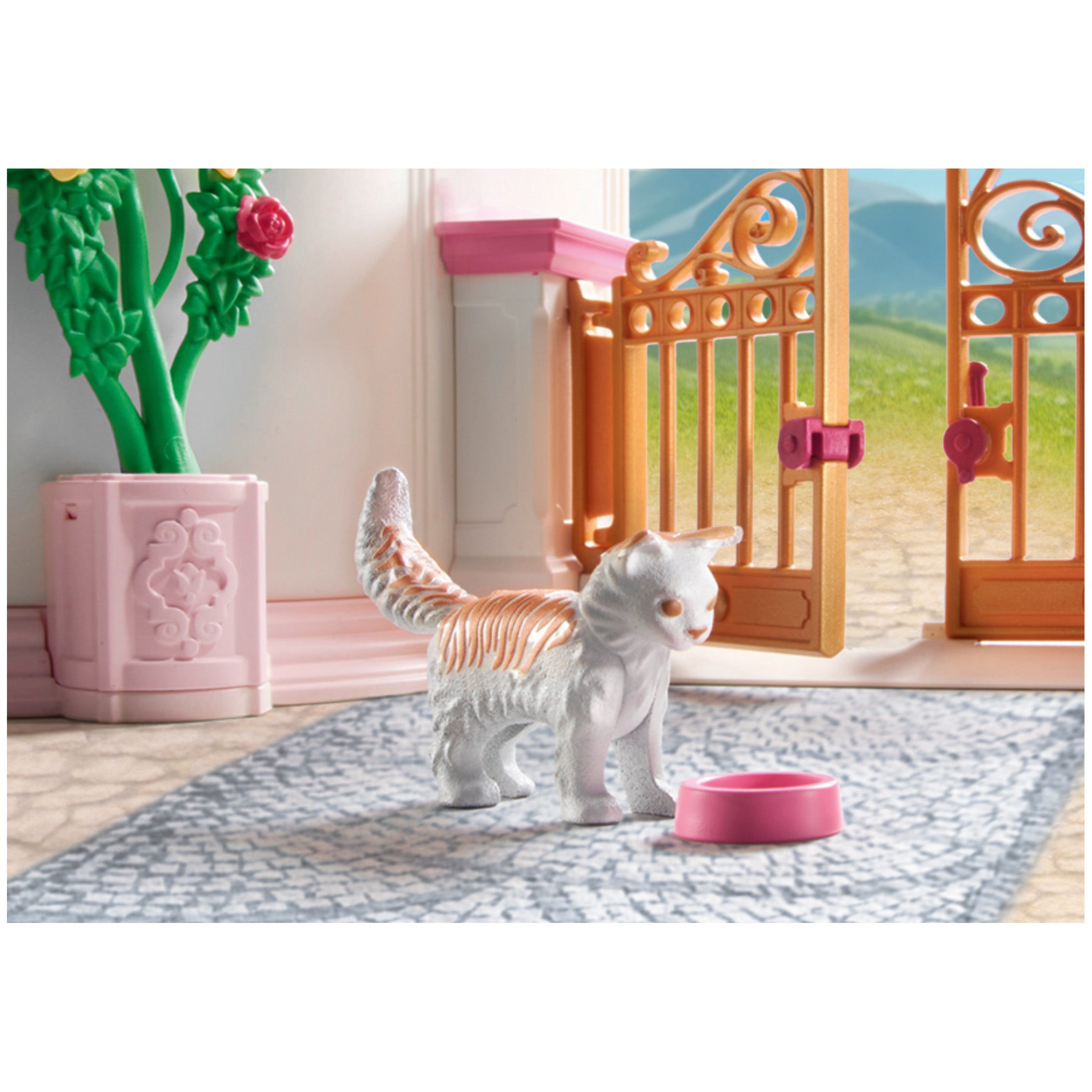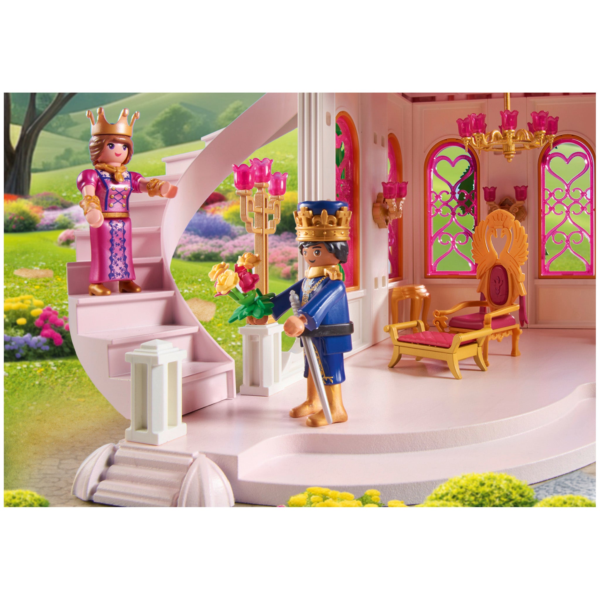 Welcome to the grand Princess Castle with royal couple by Playmobil! Here, the royal couple resides in splendid rooms with their cute Persian cat. Adorned with enchanting spiral staircases and pointed towers, the castle invites you to admire the majestic throne room, where two shining thrones and an impressive chandelier await the royal couple.