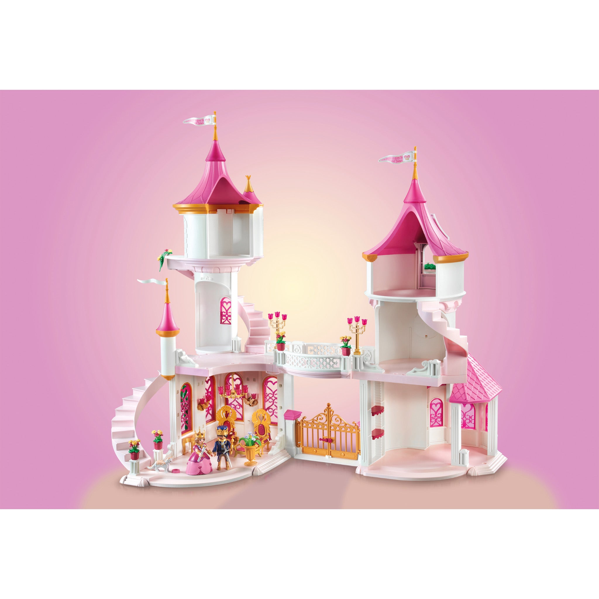 The large gate of the castle opens for the arrival of the royal carriage and the many guests attending the regular princess balls. Special highlights include the spinning dance plates, on which the prince and princess can dance to classical music. The many rooms can be furnished exactly to your liking with complementary Playmobil sets.