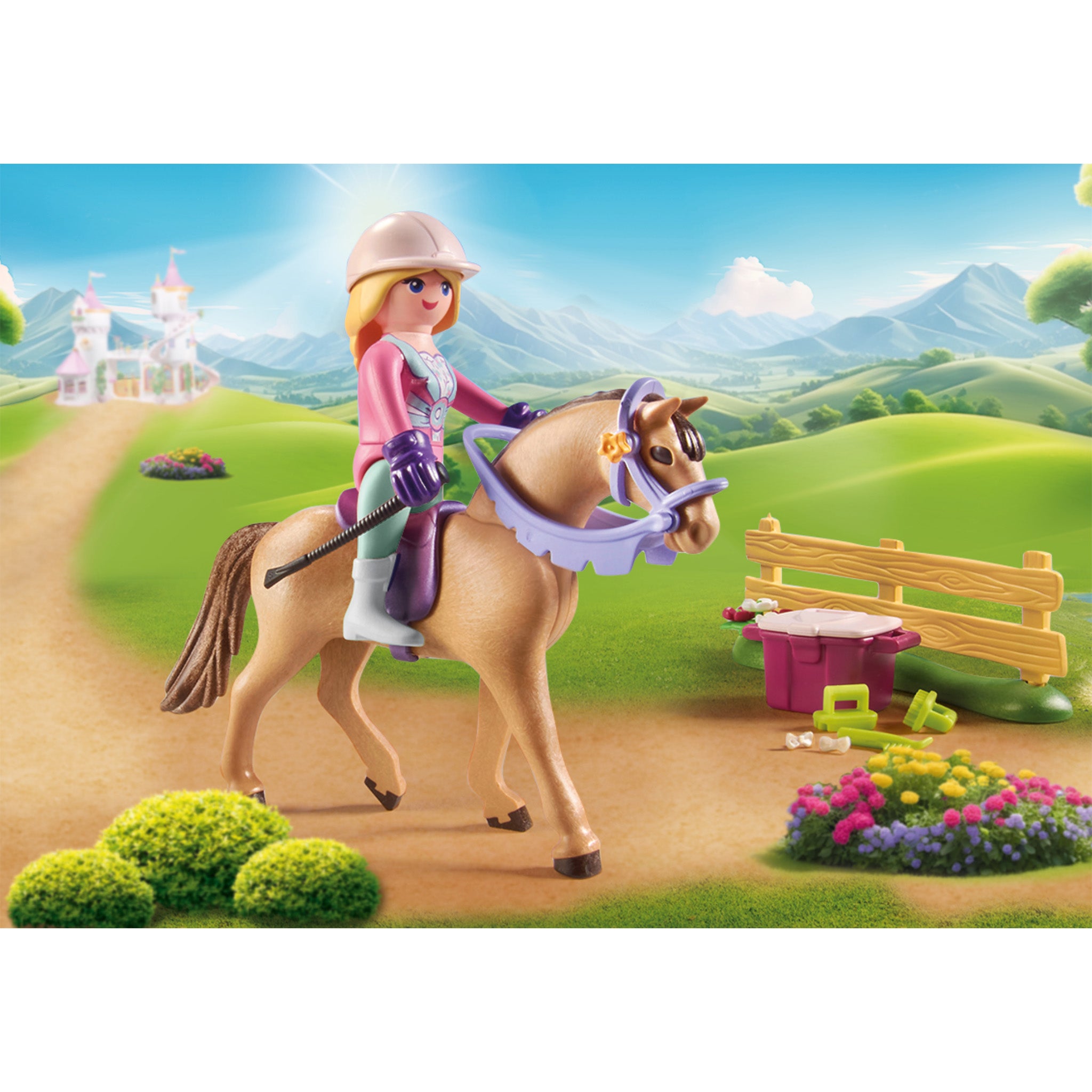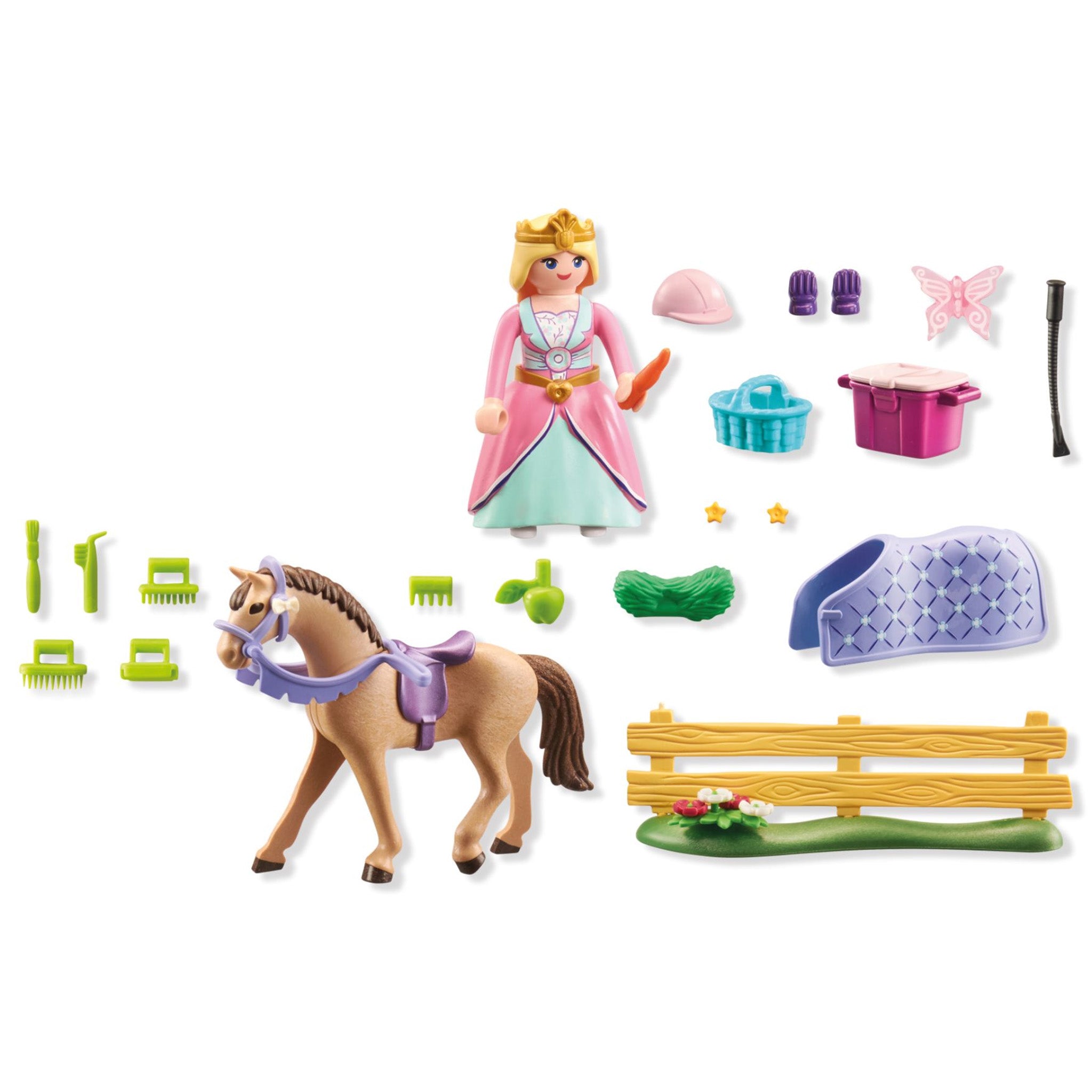 With great devotion, the elegant princess takes care of her magnificent horse. The princess is equipped with a removable skirt, allowing her to ride comfortably on her faithful steed. After an extensive ride, the horse can be rewarded with a juicy carrot and a cozy blanket once the saddle is removed. For a particularly festive occasion, the horse's harness can be adorned with shimmering ribbons and stars.