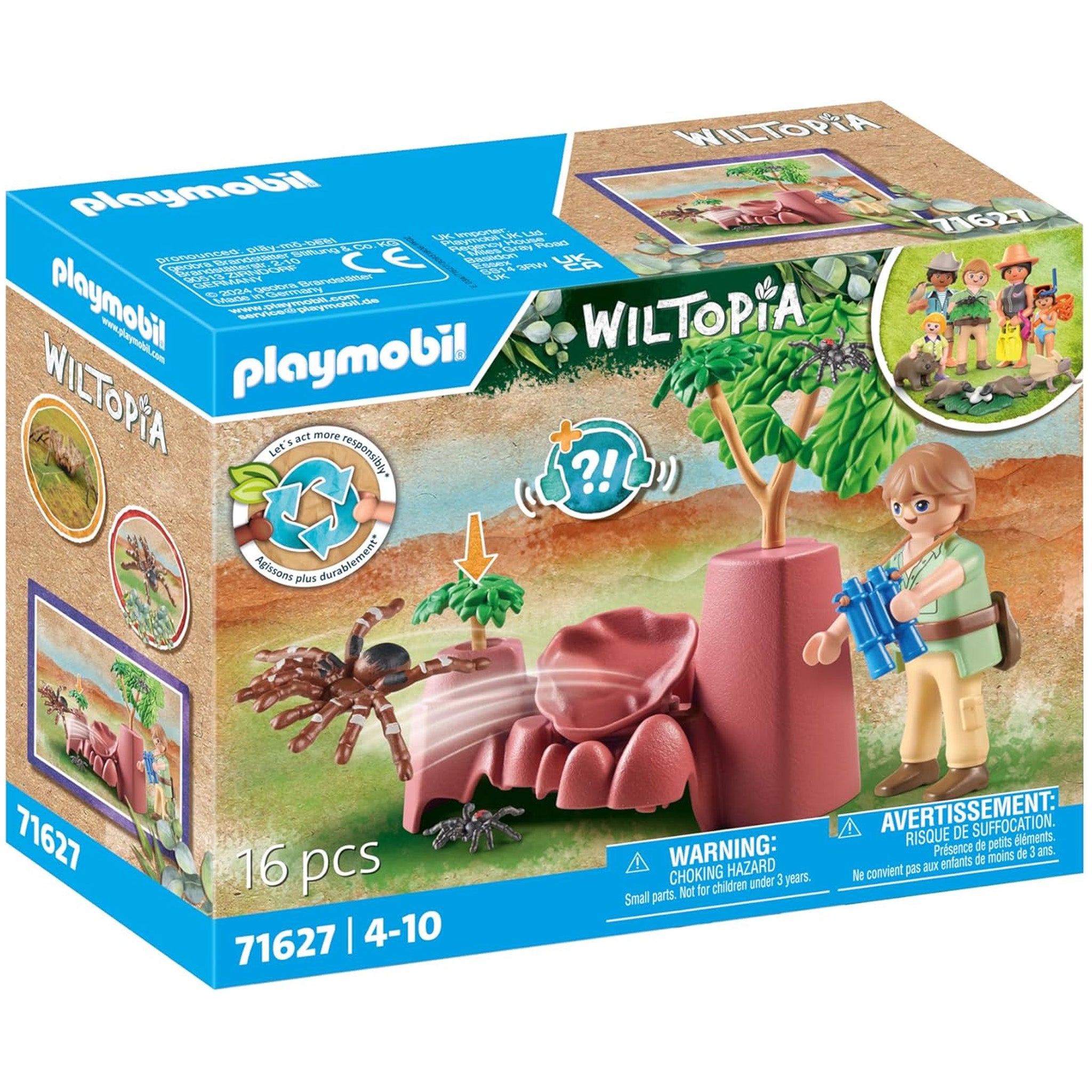 Complete with rock hideout, giant spider, and other spiders. The sustainable Playmobil Wiltopia play world takes children to familiar and exotic regions of our planet, bringing them closer to the beauty and fragility of our world and its ecosystem in a playful manner. All sets in this product line consist of over 80% recycled and bio-based materials on average.