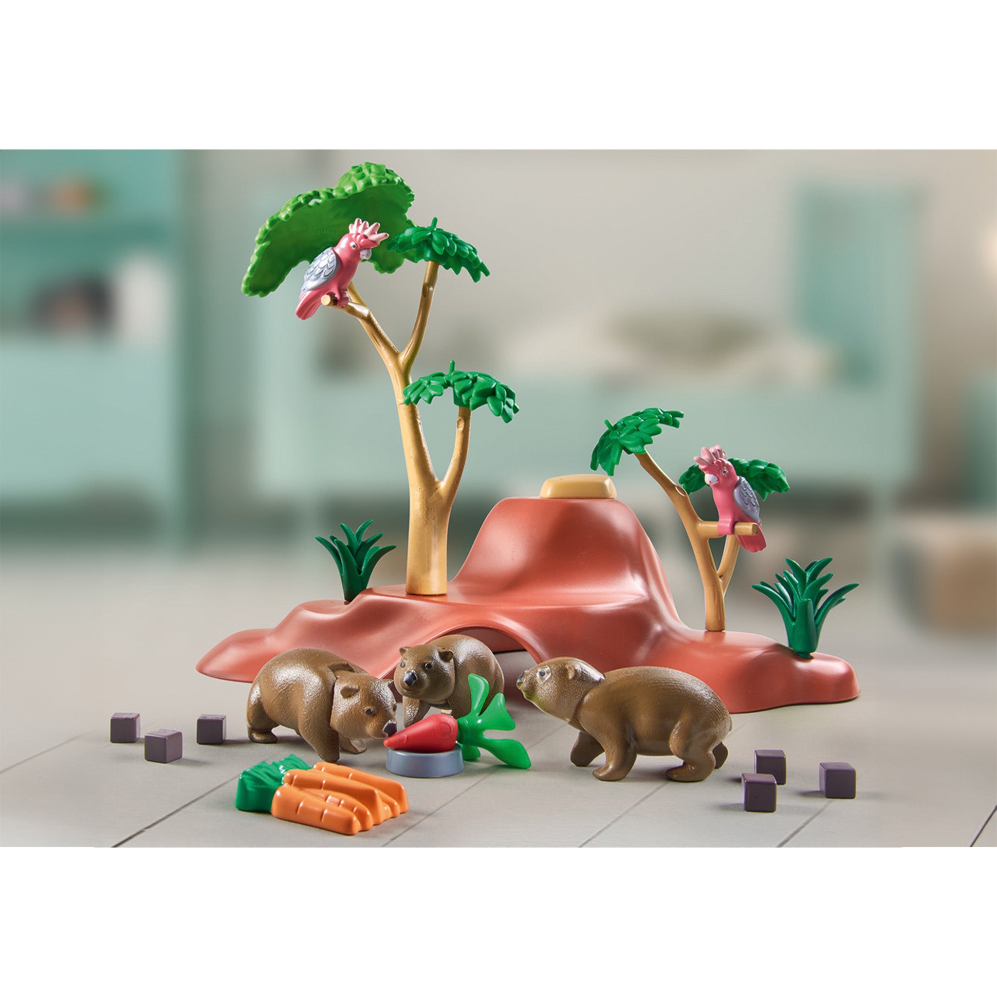 Sustainable Playmobil playset Wombat Shelter with two Playmobil figures, wombats, cockatoos, and many other great plants and accessories.
