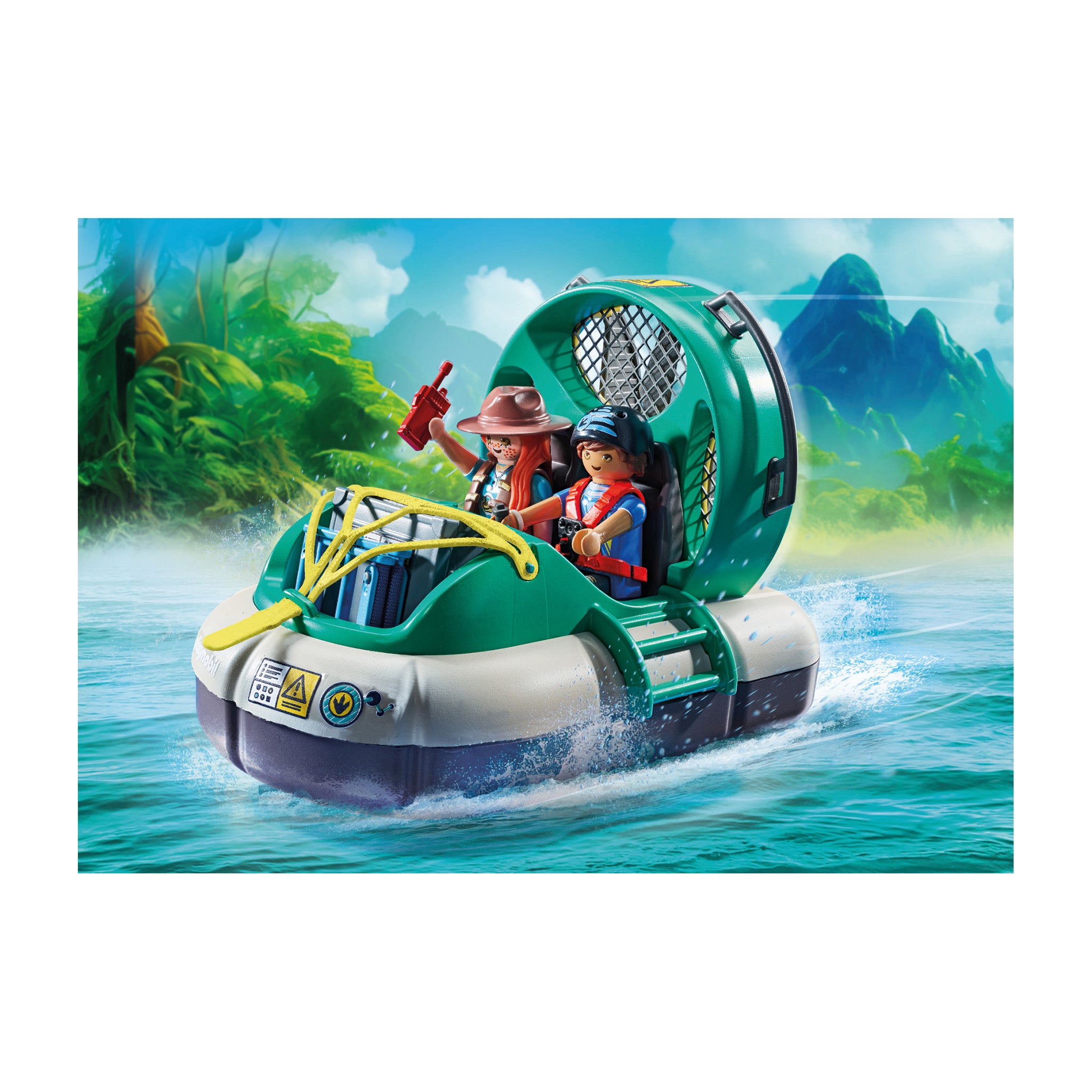 Contents: Figures: 1 man, 1 woman, Animals: 1 Brachiosaurus, 1 dragonfly, Accessories: 1 rock, 2 seats, 1 string, 1 hovercraft, 1 net, 1 attachment with propeller, 1 set of tools, 1 microscope, 3 test tubes, 1 test tube holder, 1 folding chair, 1 boomerang, 1 walkie-talkie, 1 laptop, 6 branches, 1 piece of amber, 2 halves of rock, 1 wooden board, 1 suitcase, 1 hook, 4 adapters, 1 tree top, 1 tree, 1 branch, 3 foliage, 2 plants, various flowers.