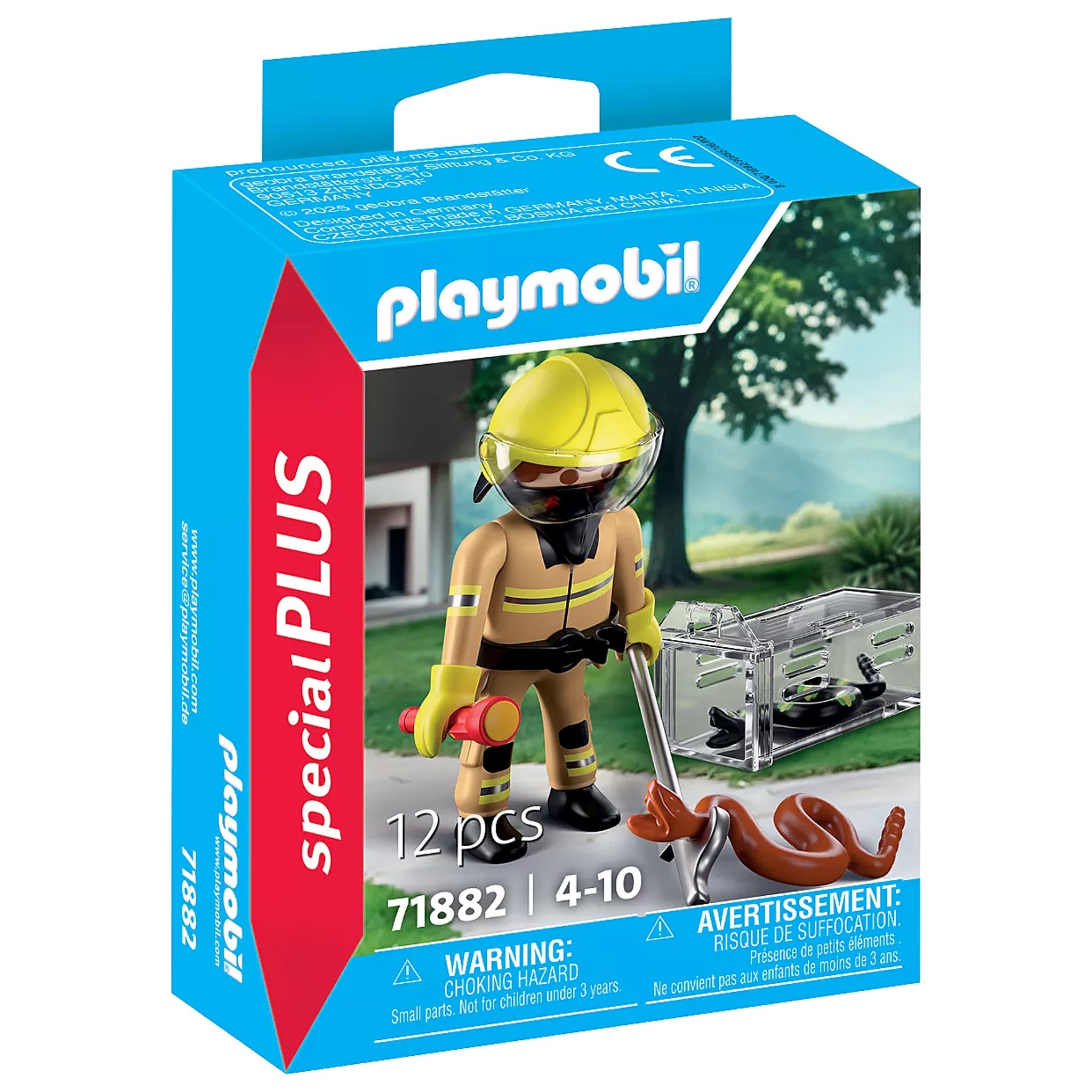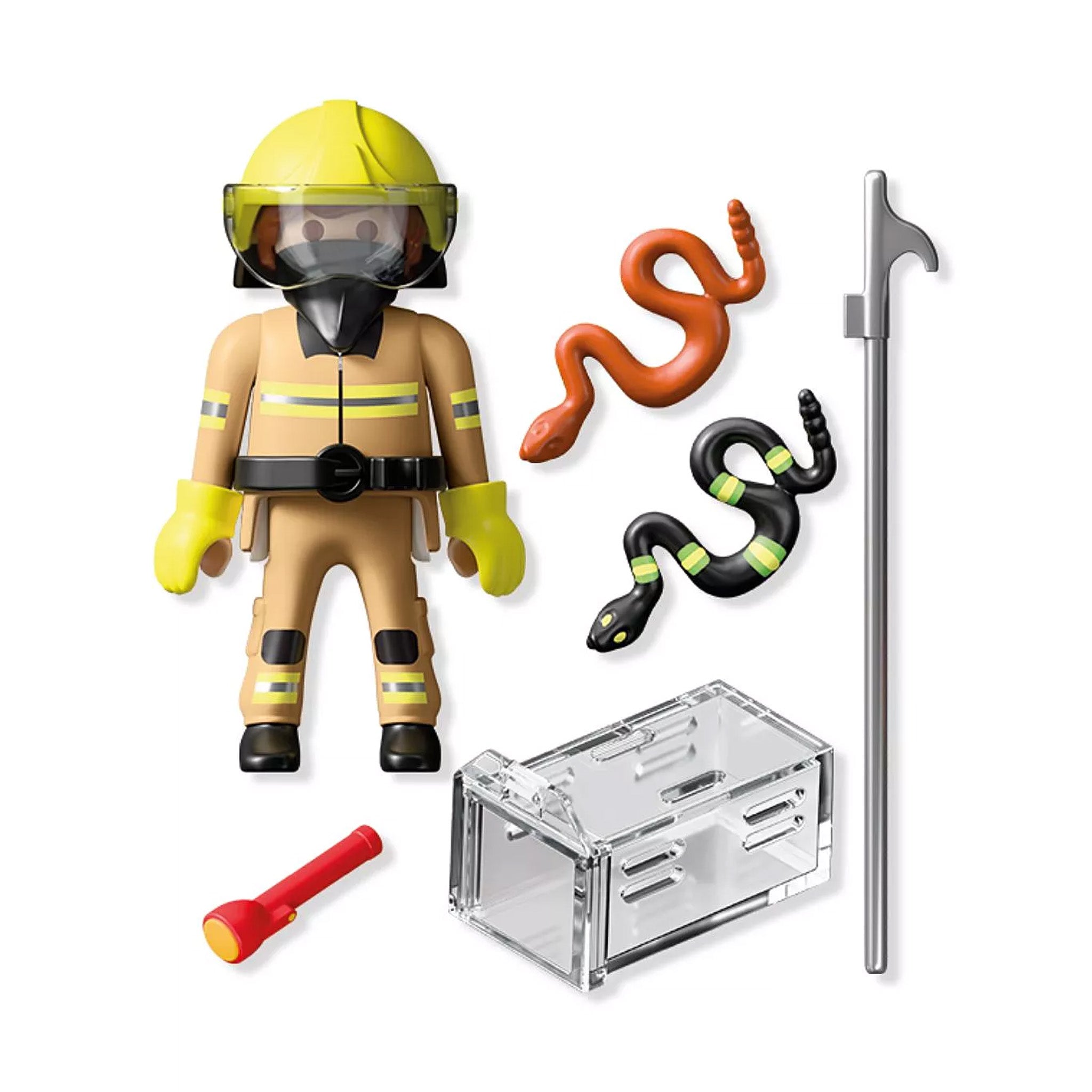 Contents: Figures: 1 fireman with helmet; Animals: 2 snakes; Accessories: 1 hook, 1 transparent transport box.