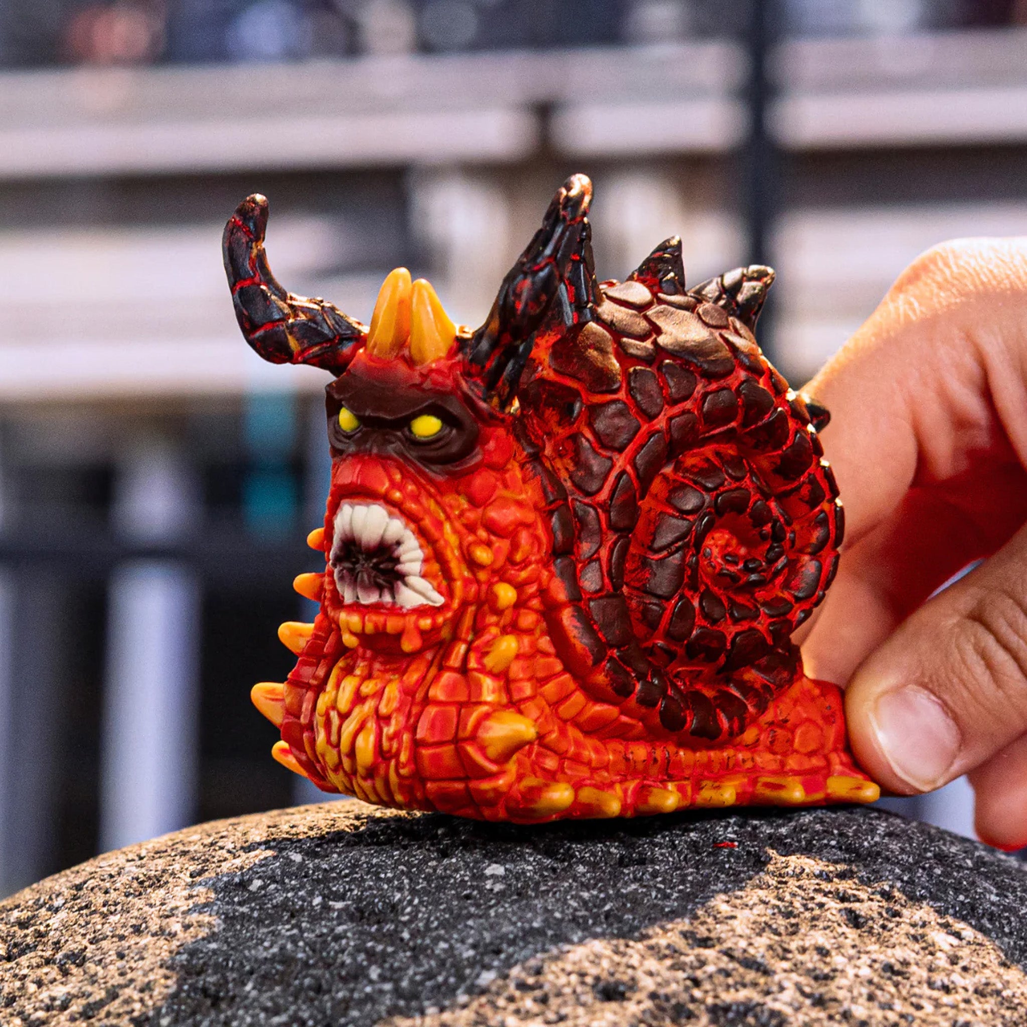 The mean Lava Snail is approaching with a trail of slime. Very slowly, she fixes her victim with her poisonous yellow eyes and then approaches. She is certainly not the fastest. But she shouldn't be underestimated! When she goes into battle, she has a clever strategy: She retreats into her shell and hides there. Her shell is impenetrable, because it’s covered in spikes. If the attacker turns away, she emerges from her shell again and bites with her sharp teeth. This tactic works frighteningly well and has made her feared throughout Eldrador. Nasty!