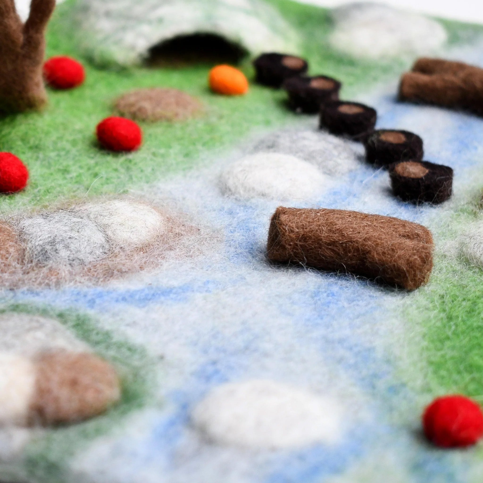 Our Woodland River playscape is designed for the little woodland animals and critters in small world play. Beautiful coloured stones and fallen logs on the gentle rivers, a small cave for the rabbit to hide into.