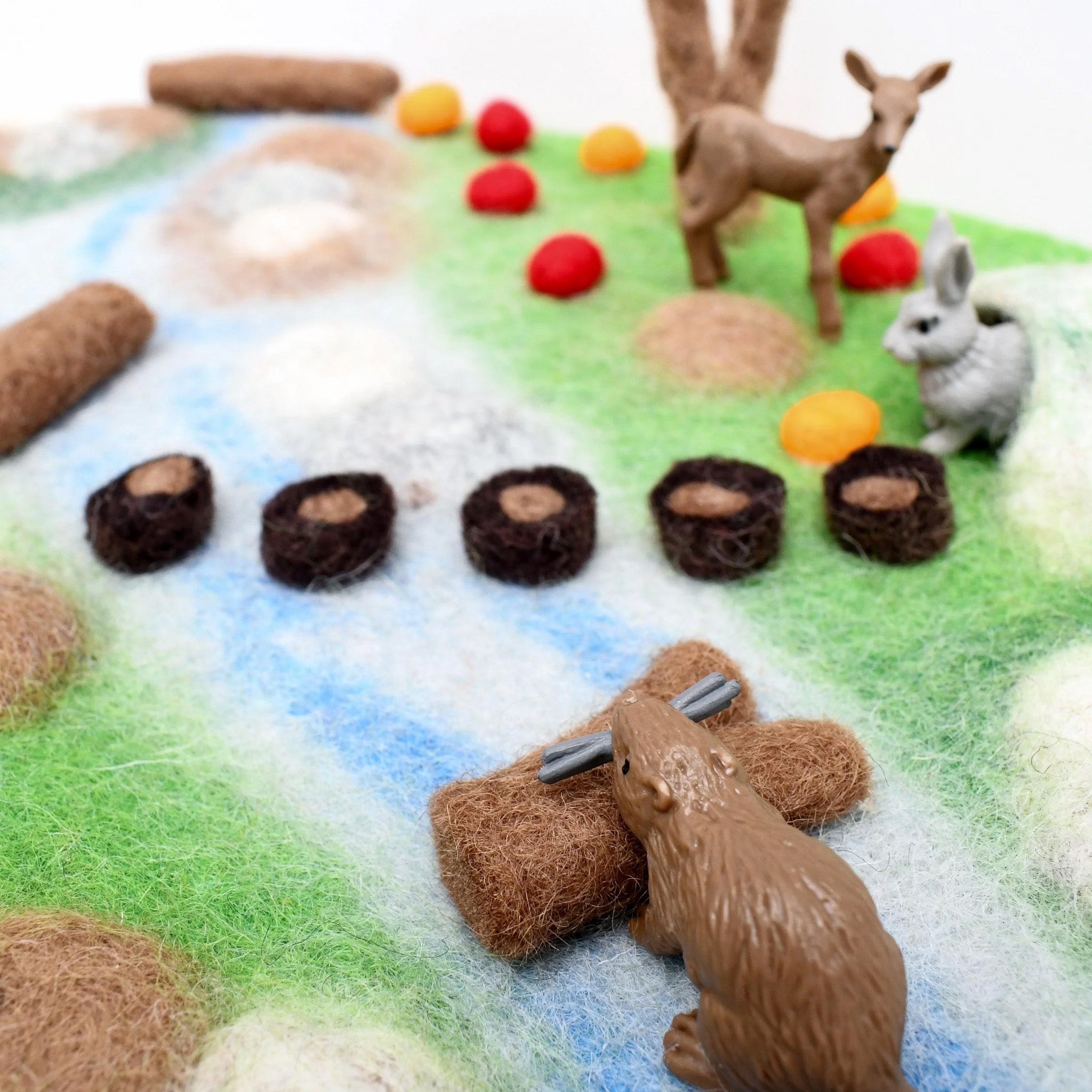 Create the perfect backdrop to an invitation to play, our felt playscapes work well with small animals. Designed by a mum to contain mess, our play mats also fits into an Ikea 'trofast' box and 'flisat' table.