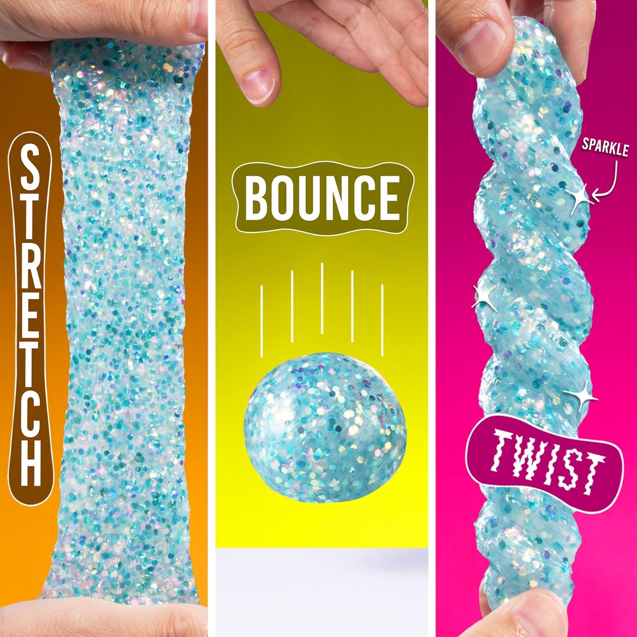 Stretch, squish, bounce, and smoosh the shimmering aqua putty and let your curiosity take you on a wave of adventure.