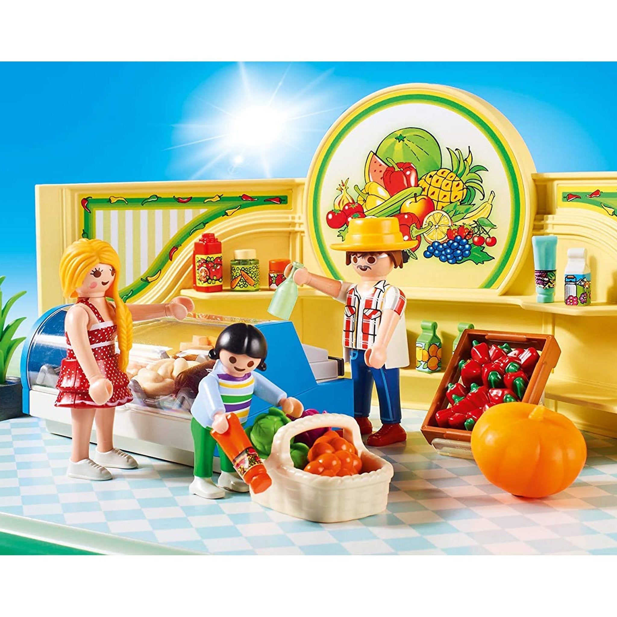 Contents: Set includes two adult figures, one child figure, peppers, watermelon, carrots, bananas, cauliflower, cheese, eggs, and other produce, cash register, produce crates, baskets, plant, produce scale, backpack, Deli display, and many other accessories.